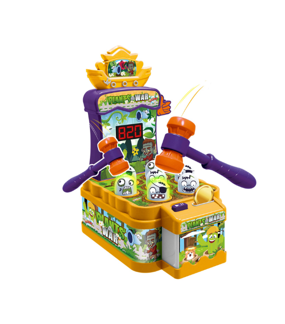 "Plants War" is an interactive whack-a-mole style game that helps children develop quick reflexes and focus. The base features plant characters that pop up and down, and players must hit them with the included plastic hammer to score points. Fun and exciting gameplay for kids.