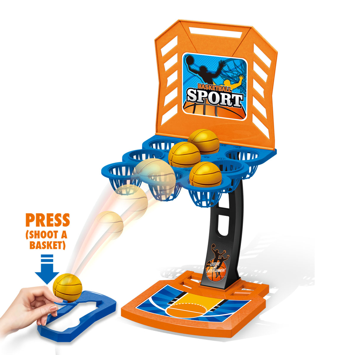The 2-in-1 Basketball Game is an exciting and fun toy that helps develop children's focus and shooting skills. Play solo or with friends by pressing the launcher to shoot the ball into the hoop and try to score as many points as possible.
