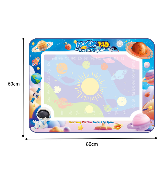 Educational Water Drawing Mat for kids with a space theme, allowing children to draw creatively using water pens with no mess. Includes shapes and stencils for learning letters, numbers, and animals, helping to develop creativity and fine motor skills.