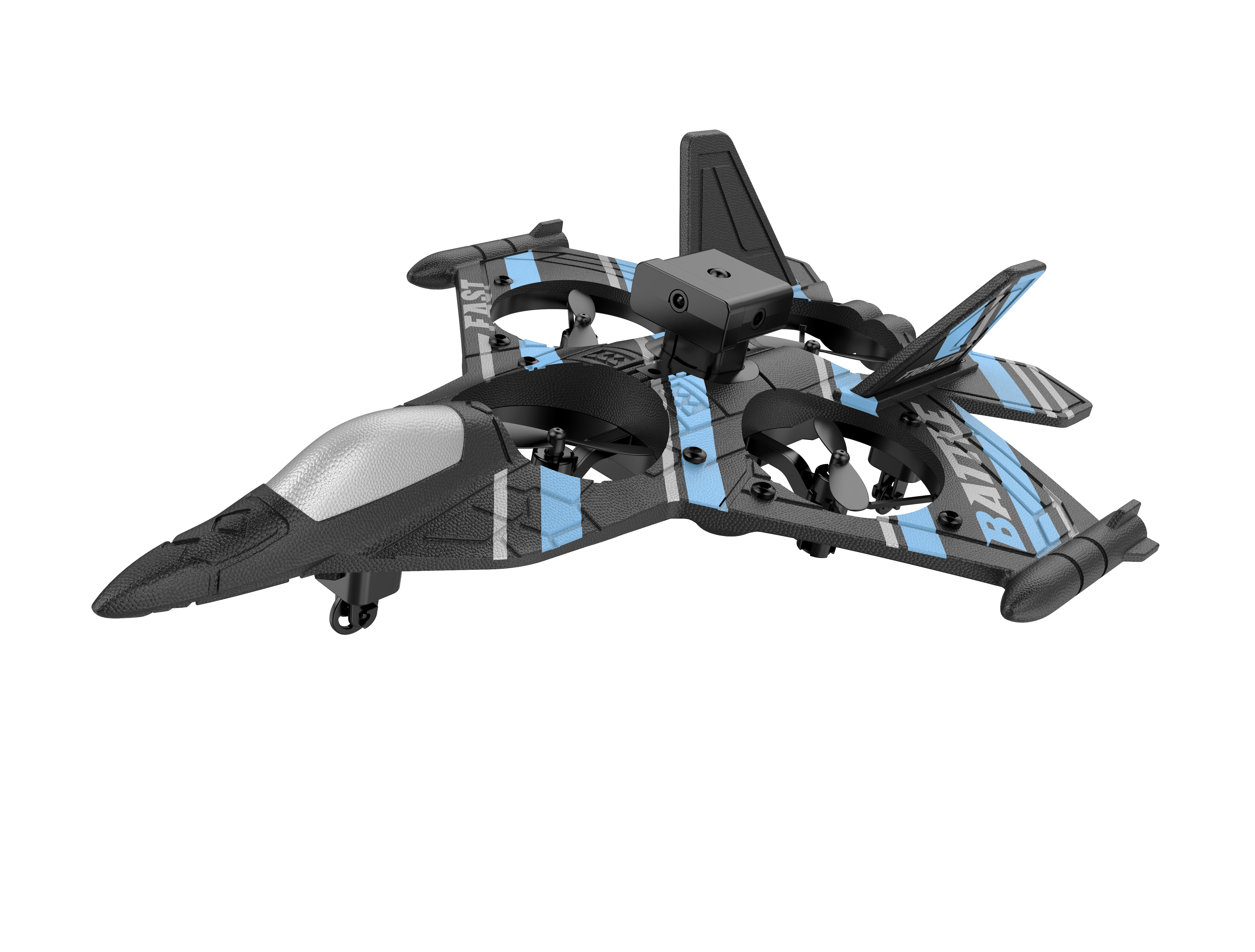 Fighter drone with a sleek design and vibrant colors, equipped with remote control technology for 360° flips and LED lights for an impressive aerial look. Perfect for flight enthusiasts and aerial adventures.